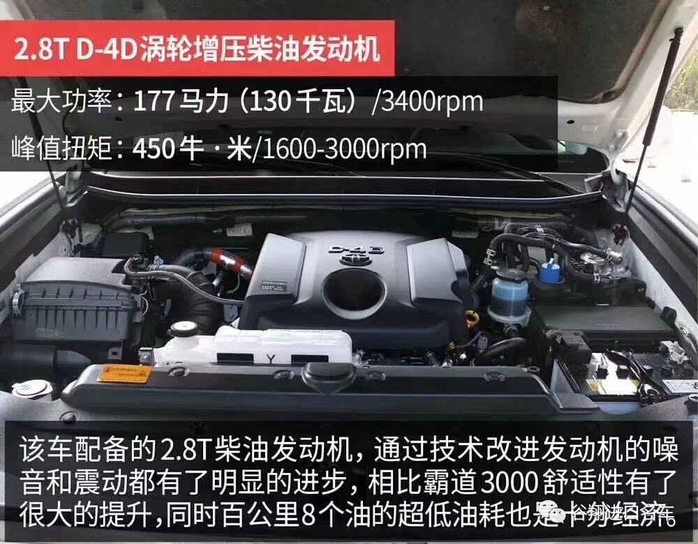 [2.8T和3.0T的区别]:柴油霸道2.8T和3.0T这两款发动机都称为D4D发动机,D4D只是这类技术的称谓,意思是直接喷射的4冲程柴油发动机,在柴油发动机种类中,属于高压共轨柴油发动机。这两款发动机是同时存在的,欧版的2.8T柴油霸道不管是18款还是19款都是2.8T的发动机,发动机型号为1GD ,专供日本本土、澳洲和欧洲使用(因为2.8更环保的原因)。而中东版的柴油霸道不管是17款、18款还是19款都是老款的3.0T发动机,发动机型号为1KD。