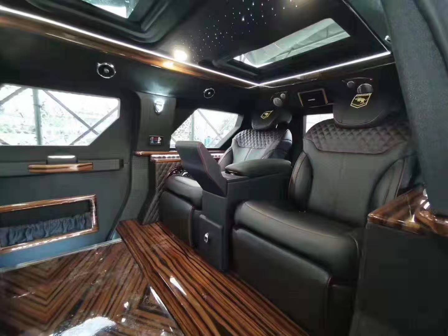 乔治巴顿内饰方面:经过高档双色真皮重新包裹,搭配木纹饰板点缀,使得原本就宽敞霸气的内饰更显豪华。细节方面,乔治巴顿车身侧面延续了粗犷的设计风格,外跑的轮眉、见棱见角的车门以及其本身超长的轴距尺寸,看上去就不是好惹的。