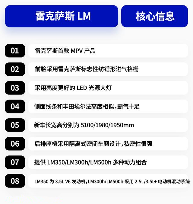 本次发布的车型雷克萨斯LM300h,搭载了一套2.5L混合动力系统,新车还将提供多款LM350/LM300h/LM500h供选择。LM350搭载3.5L V6汽油发动机,LM300h/LM500h车型分别采用2.5L汽油机+电机和3.5L汽油机+电机的混合动力。
