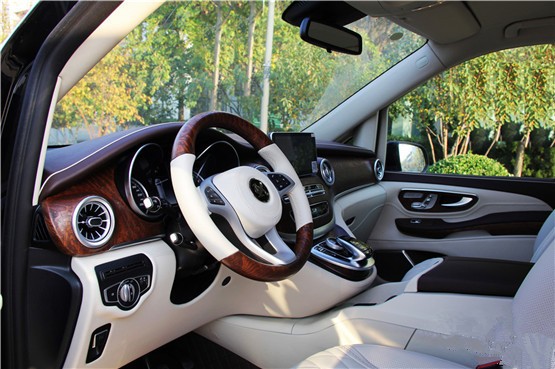 进入到奔驰VS880商务房车的驾驶舱,方向盘及中控饰板升级大面积的碳纤维,很多地方都体现出定制的元素,奢华的氛围给的很到位。奔驰VS880商务房车驾驶舱的座椅经过升级,采用了菱形缝线真皮包裹,乘坐舒适感非常不错。