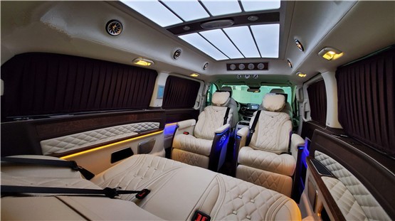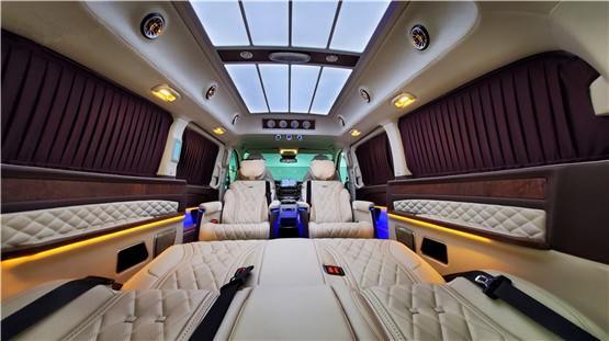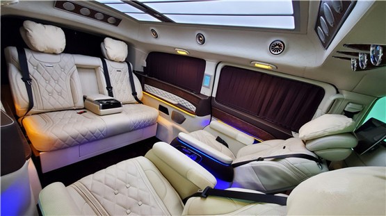 奔驰VS880商务房车中排的航空座椅拥有真皮包裹,全电控多向调节及加热通风、座椅按摩、支持舒适躺平腿拖。驾驶区扶手箱后面有一块超大的控制屏,可调控全车的音响及全车的氛围灯系统,让您于指尖掌控全车功能。
