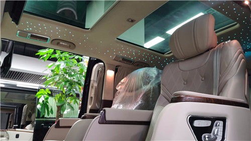 2020款奔驰V260L改装商务车第二排航空座椅为带电动、加热、按摩、通风功能的航空级首长席,可沿着地面上滑轨实现一键电动式前后滑动,对于这种智能化的乘坐体验,是原厂车型笨拙的手动拖拽模式所望尘莫及的。车内的氛围灯打开后,奔驰V260内舱变得灵活多变,气氛也可以根据主灯颜色变换而变化,主要的乘坐座椅配置的独立的按摩功能,通风加热,一体腿托,功能丰富,乘坐舒适,是商务接待用车的代步良品。