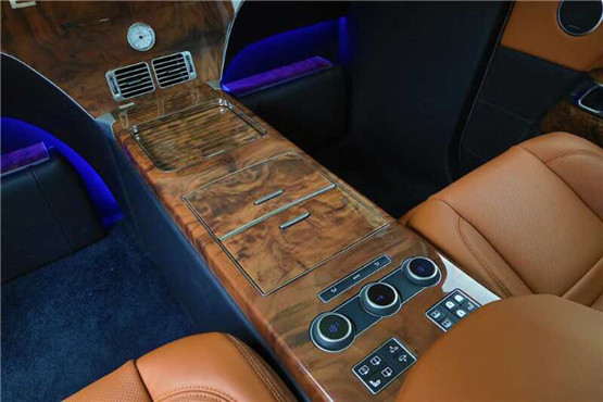 内饰的部分是运用了彰显贵气、同时也便于打理的橙色系,选材自北欧极寒之地的纯正小牛皮;另外我们可以看到在这款路虎揽胜行政创世加长版的内饰风格,无论是视觉享受、细节触感、座椅的舒适度调教,都有原型中规车难以望其项背的优越性。