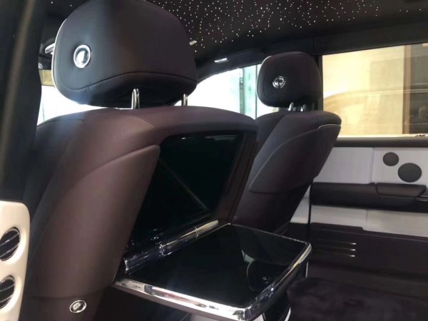 劳斯莱斯幻影加长版后排才是重中之重,电动折叠板和后排影院系统被巧妙的隐藏在前排座椅的椅背后,只需轻触按钮,便可以自如收放桌板和影院系统,带来完美的剧院体验。后排中央固定扶手做了重点优化,其中国可容纳带有威士忌酒具的酒柜、香槟酒具和冷藏箱,方便乘客畅快交谈,后排座椅角度可以任意调节,这一设计让客户无需转头便可视线自如交流。整个车厢内饰全部以最精美的高档材料装饰,使车内极具触感。