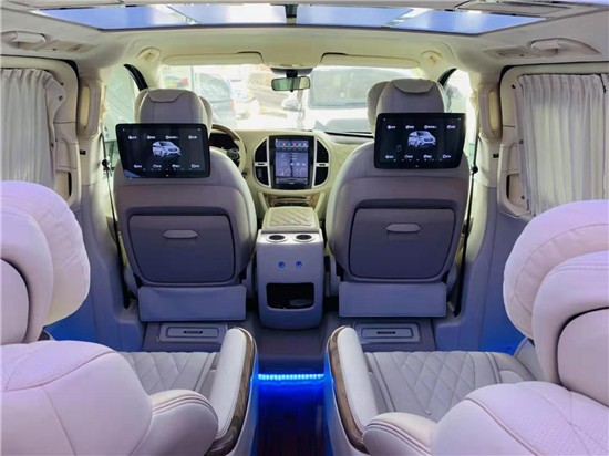 带有按摩加热通风功能。后舱前为两个独立航空座椅,第二排座椅安装进口首席航空座椅,加热通风按摩功能齐全,最大限度的减缓您的乘车疲惫。八向电动调节:电动头枕,电动腿托,前后电动调节,电动靠背调节。第三排为一组沙发座椅(可电动展平,形成一张舒适的沙发床)。