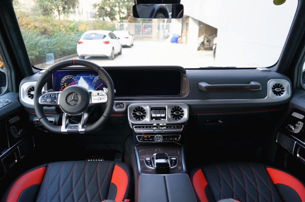 2020改款全新G63内饰方面,新G63保留了新G500的整体设计,除配色差异外,新车还换装了全新造型的平底式AMG运动方向盘,其两侧配以打孔皮质包裹,下部镀铬装饰的造型也与新G 500明显不同,看上去十分战斗。