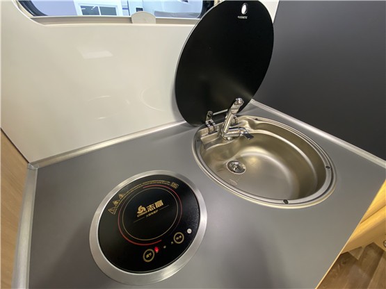 厨房与卫生间设计在会客厅后方靠车门的位置。从图中可以看出整个的空间也是很大的。搭载家用220v圆形电磁炉、房车专用调料架,方形带盖超大洗菜盆。