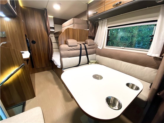 宇通依维柯房车会客区改变传统沙发卡座的设计,采用乘用车座椅,整体包裹性和安全性更佳。中间的升降式多功能用桌可就餐,也可休闲。上方的储物吊柜设计时尚,质感十足,功能实用性也强。