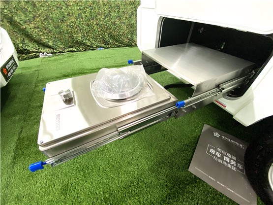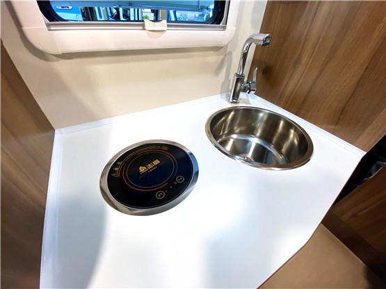厨房区是位于进车门的左侧,各项设施精致丰富,给车友家用厨房式体验。一体式燃气灶洗菜池、收纳篮、置物架、挂物钩、储物柜等设施被安排得满满的。