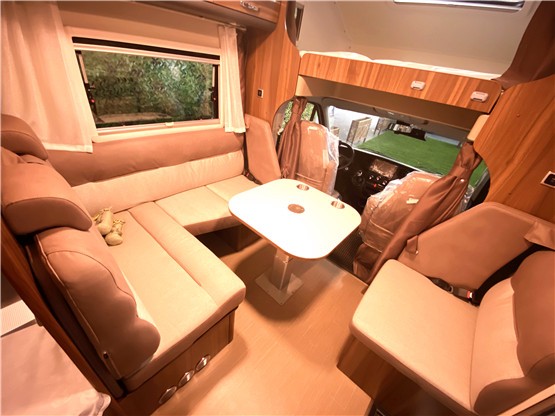 宇通依维柯房车内部欧式装修风格精致豪华,原木色的板材搭配超纤布艺温馨舒适。从前往后的功能布局依次为额头床、会客卡座区、厨房区、上下铺睡卧区和独立卫生间。