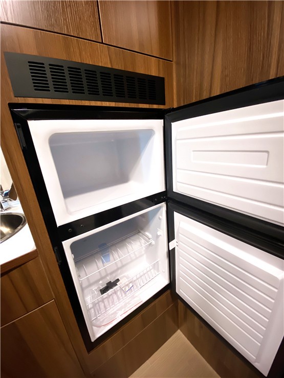 房车专用车载冰箱是位于进车的另一侧,110L的容积足够储存丰富的食材;在冰箱上方是机械式总控开关,操作更加直观简便。