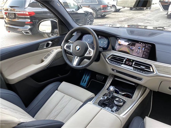 19款宝马X7融入最新家族式设计元素,内饰大部分区域由银色饰条及木质面板加以点缀,配备带有注意力监测的液晶仪表盘及全新的三辐式多功能方向盘,中控区域为悬浮式触控显示屏,下方为空调出风口与实体功能按键,杯架处还加入可为饮品制冷或加热的功能,换装全新的水晶电子档把。除此之外,新车还配备了Vernasca皮革内饰,四区气候控制系统及三段式全景天窗。
