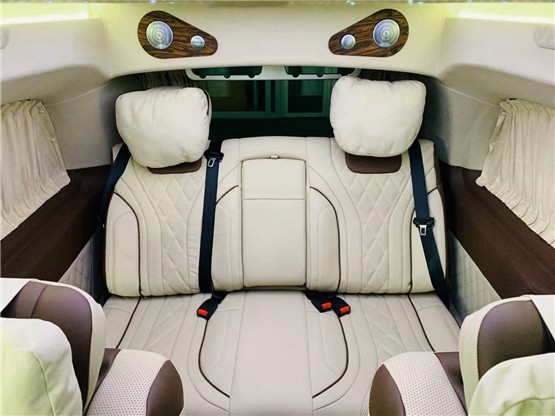 这台车为什么叫奔驰迈巴赫版VS680呢,主要是后舱的内饰和迈巴赫的原厂座椅。车身全部皮革包覆,檀木面板奢华点缀,牛皮地毯,迈巴赫宫格顶灯,以及绒质窗帘一应俱全,还有两张定制的迈巴赫总裁座椅,十分舒适豪华,通风加热,气压按摩,三段调节等功能加持。后排的沙发座椅可以放平成为双人床,尾车上出行人员提供舒适的休息。