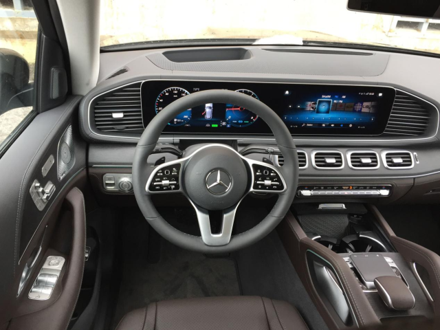 2020款奔驰GLE450内饰则延续了现款S级 (配置|询价)的造型,用的是贯穿式中控台双屏设计,12.3英寸的双液晶显示屏带来的科技感爆强,并且搭载了奔驰最新的MBUX人机交互系统,采用搪塑,皮革,实木,金属和碳纤维材质,三幅式平底方向盘动感十足,头顶一个全景天窗,座椅用的是双色搭配的动风格座椅,舒适性和包裹性也比较好。