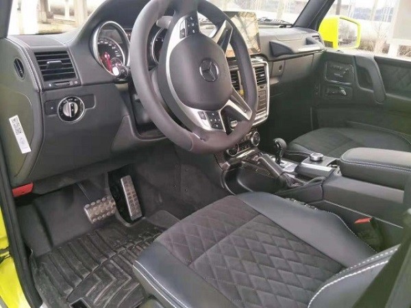 奔驰G (配置|询价)5504×4² 全球限量版 柠檬黄/黑 报价338万 配置:离地距离 450mm、涉水能力 1米、轮胎间距 1.744mm、3把差速锁、22寸轮毂、每个轮胎带有两个减震器及两个悬架弹簧单天窗、22轮、红卡钳、双减震、氙灯LED日行灯、多轮廓电动包裹座椅、翻毛皮内饰(翻毛皮双色座椅、翻毛皮方向盘、翻毛皮门板、翻毛皮内顶)、前排座椅通风加热、排座椅加热、哈曼音响(14个扬声器)、三把差速锁、中控碳纤维装饰、碳纤维轮眉、底盘舒适度调节、脚踏、前电眼、倒影、导航、多功能方向盘(蓝牙、换挡拨片)、隐私玻璃