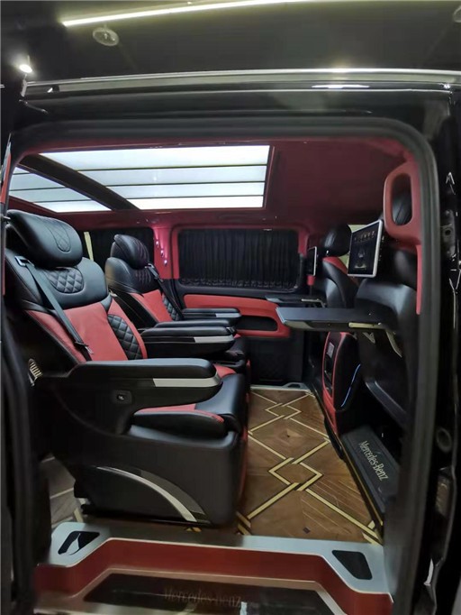 奔驰威霆改装商务车 商务接待内饰太奢华了,首先,在座椅部分,宽大厚软的真皮座椅,具备多向调节与按摩等功能更佳;毕竟MPV不是小巴士,不必追求座位数量;MPV改装应追求乘坐体验,为达到此目的,换上一套大沙发也未尝不可。得益于MPV巨大的内部空间,改装内饰时自由度更高;玩家们可以毫无压力地在MPV的车厢里打造一个豪华包厢,让乘客在行驶过程中获得豪华体验。