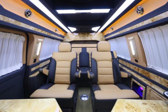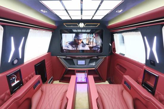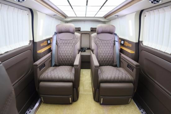 20款奔驰V260L改装商务车第二排航空座椅为带电动、加热、按摩、通风功能的航空级首长席,可沿着地面上滑轨实现一键电动式前后滑动,对于这种智能化的乘坐体验,是原厂车型笨拙的手动拖拽模式所望尘莫及的。车内的氛围灯打开后,奔驰V260内舱变得灵活多变,气氛也可以根据主灯颜色变换而变化,主要的乘坐座椅配置的独立的按摩功能,通风加热,一体腿托,功能丰富,乘坐舒适,是商务接待用车的代步良品。