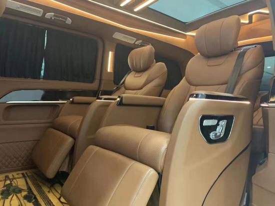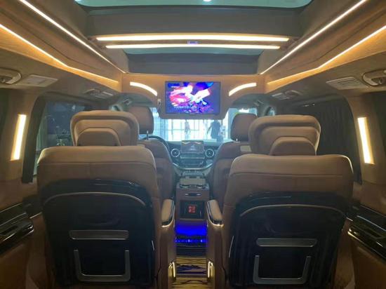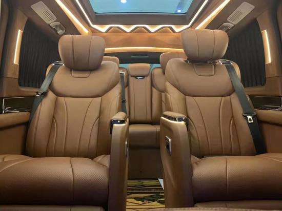 后车舱配置两张航空头等舱级别的按摩座椅,乘坐十分舒适,具备多项功能,前面还安装了两张可收缩桌板,十分符合商务车的定位。后排是三人联排沙发座椅,可以放平成双人床休息使用。