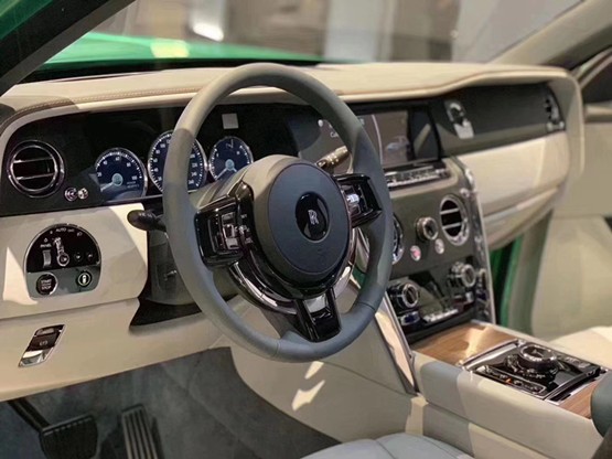 劳斯莱斯库里南内饰将劳斯莱斯的奢华与简洁对称的功能之美融为一体。中控面板的边框由手工打磨的金属条包裹,不仅将上部的仪表板和中部的控制台连接起来,更通过容纳仪表板上的横向设计元素,增加了掌控感。三幅式设计的方向盘看上去尺寸不小,足够厚实。中间多功能控制区有实木点缀,以至于开着库里南也有一种生活的仪式感。