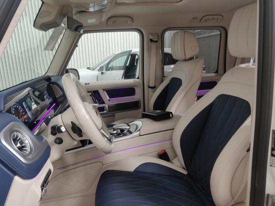 换代的最大最大亮点之一,给人耳目一新的感觉,双12.3英寸液晶通体屏幕外加与奔驰E (配置|询价) COUPE相同的空调出风口设计,让大G的内饰更加豪华,科技感也有所增强。沿用多年的四辐式方向盘也改为三辐式设计,三点以及九点处的多功能按键也与S级 (配置|询价)车型相同,两侧黑色触控按键可以控制仪表盘信息,其中行车电脑和右侧模拟仪表都可以进行切换,可显示油耗、续航里程、车辆状态等信息。在内饰用料方面,奔驰全新G级内部均采用了真皮材质包裹,手感极佳。在副驾驶台上还增加了碳纤维扶手,保护了车内人员在行车时的安全性。