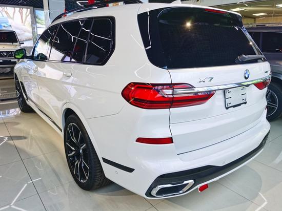20款宝马X7车尾设计线条简单动感华丽,车顶是小巧的鲨鱼鳍天线,搭配微微下压的扰流板,让车身非常具有运动气息,大灯字被一条镀铬饰条贯穿连接,形成了一个回旋镖的造型,内部光源是多条灯带组成的刹车灯,点亮以后非常漂亮,大面积的几何横切面和曲面造型让车尾具备了爆棚的肌肉,厚重的车尾杠两侧是雾灯区,造型规整与上面的大灯交相呼应,为车尾营造了不错的光影。