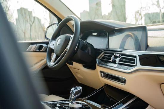 内室12.3英寸全液晶显示的仪表盘、搭载了iDrive7.0系统的,依旧支持语音、触摸和手势多种操控方式的中控屏幕、可制冷/加热的杯架、香氛系统以及水晶质感的挡把。音响方面新车配备有1500W功率的20个扬声器,比新7系多出4个,注意力监测的液晶仪表盘及全新的三辐式多功能方向盘,中控区域为悬浮式触控显示屏,下方为空调出风口与实体功能按键,,除此之外,新车还配备了Vernasca皮革内饰,四区气候控制系统及三段式全景天窗X7采用了重视驾驶位的设计,中控面板向驾驶位倾斜,更方便驾驶员操作。在设计风格上,简洁而富有科技感,用料和工艺都达到了同级别的上乘水平,硬朗的线条,更具视觉张力,符合其运动化的定位