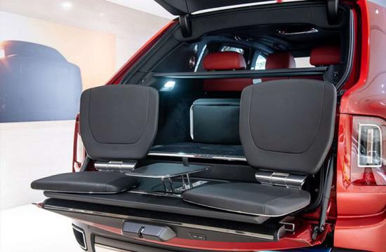 为保证血统纯正,库里南虽为SUV但依然采用了幻影对开门式样设计,在车尾,新车隐藏式设计了一个浪漫功能那就是伸缩式揽景座椅,只需一键开启,隐蔽在后备箱的两个真皮座椅和鸡尾酒桌便会缓缓展开,这样合着伴侣在野外也可以带一次豪华派对。