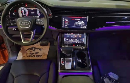 车厢内部,会感觉奥迪Q8和全新A8的设计高度雷同。奥迪全新家族化设计,科技感十足的虚拟驾驶舱氛围,同样的三块大屏,横向贯穿的前排空调出风口。中控台采用大面积的真皮包覆,且向驾驶员一侧倾斜,形成以驾驶员为中心的驾驶舱。整个中控采用了全触屏来对车辆进行操控,没有一个实体按键,对技术要求极高,非常的高大上。车以及启动发动机。标配个性化设置使车主可以在个人资料中存储多达400个优先参数