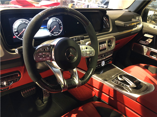 2020款全新G63内饰方面,新G63保留了新G500的整体设计,除配色差异外,新车还换装了全新造型的平底式AMG运动方向盘,其两侧配以打孔皮质包裹,下部镀铬装饰的造型也与新G 500明显不同,看上去十分战斗。此外,全液晶仪表盘 中控大屏的双12.3英寸屏幕设计在新车上也没有缺席,营造出了浓郁的科技感。