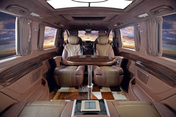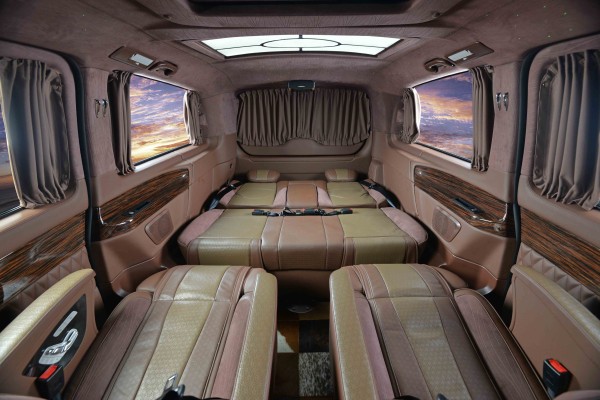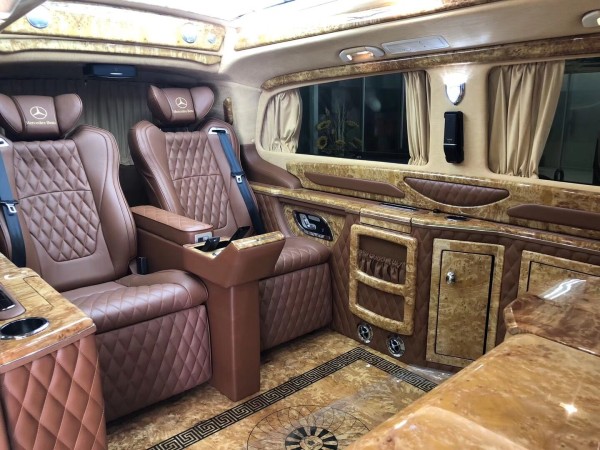 20款奔驰V260L驾驶舱与后舱是分隔设计的,形成两个独立的空间。中间由一台超大液晶升降电视(32寸)及柚木多功能吧台及柏 林之声音响组成,整车环保真皮包裹,金网花地板铺设,豪华感无处不在。全部采用真皮制作,豪华木饰装点,装有按摩加热通风功能。后舱前为两个独立航空座椅,后为一组沙发座椅,后舱的车灯也很用心,尤其是两侧的长条照明灯,做得很有中国风。车顶设计了双景超大电动天窗,白天可大大增加车内的采光,夜晚可以享受梦幻的星空。