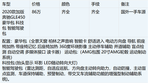 20款奔驰GLE450参数配置:发动机:3.0T 367马力L6,变速箱:9挡手自一体,排量(L):3.0,长*宽*高(mm):4935*1935*1796,轴距(mm):2995,最大拖挂重量(kg):3500,车身材质:钢铝混合,油箱容积(L):85,行李厢容积(L):630,最大行李箱容积(L):2055,进气形式:涡轮增压,气缸排列形式:L,气缸数(个):6,每缸气门数(个):4,最大马力(ps):367,最大功率(kw):270,最大功率转速(rpm):6100,最大扭矩(N·m):500,最大扭矩转速(rpm):4000,驱动方式:前置四驱,四驱形式:全是四驱,助力类型:电动助力,车体结构:承载式,轮胎规格:275/50R20。