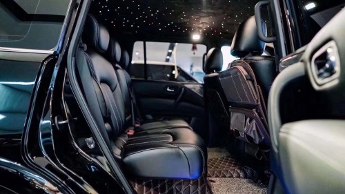 2019款日产途乐Y62中东4.0该车尾部设计高大威猛的感觉更加突出,其尾灯组整体采用了全透明处理,并融入了LED光源。