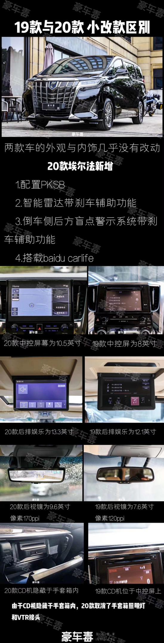 20款埃尔法 (配置|询价)是市场上的最新款,也是它的全新一代车型,相比于17款和18款来说,19款埃尔法由17款和18款的丰田车标改为了现在字母埃尔法的车标,除此之外,19款车前脸的配置还有360°环车影像、前置的泊车雷达、雾灯以及全新一代的氙灯LED,还有转向的流水大灯。