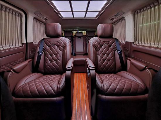 进口威霆改装房车座椅180度旋转后放上小桌板,进口威霆改装房车贵宾舱座椅可以形成一个多会议的格局,可以在车内就进行商务洽谈和办公。