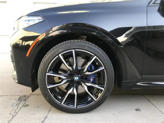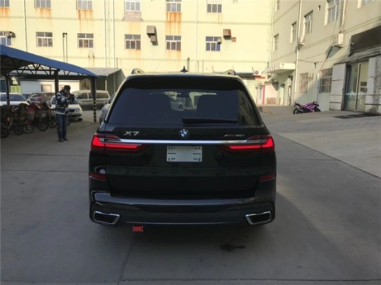20款宝马X7车身侧面上方配有黑色行李架,前翼子板下方为长条状空气导流槽,腰线较为低矮且呈上扬之势,选用21英寸双五辐式拼色轮毂。车尾造型方正,LED尾灯组与粗壮的银色饰条贯穿相连,采用上下分段式电动尾门,排气采用双边共四出式布局,保险杠下方两侧配有大尺寸镀铬尾喉装饰。