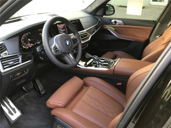 20款宝马X7内饰部分,宝马X7采用最新家族式设计语言,使用大量真皮、木纹饰板进行包裹。配备12.3英寸带有注意力检测的全液晶仪表和12.3英寸悬浮式触控显示屏。空调出风口与温度显示屏、实体功能按键结合在同一区域,并使用银色装饰条进行点缀。下方盖板下方为带有加热、制冷功能的杯架,全新的水晶电子挡杆造型十分精致,进一步提升了车内的豪华氛围。