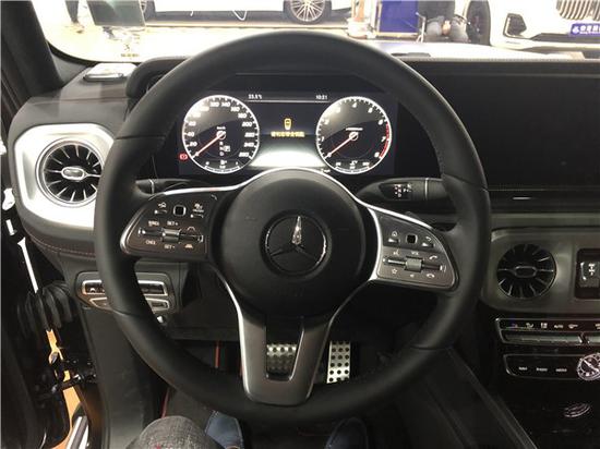 2019款全新内饰方面,新保留了新G500的整体设计,除配色差异外,新车还换装了全新造型的平底式AMG运动方向盘,其两侧配以打孔皮质包裹,下部镀铬装饰的造型也与新G500明显不同,看上去十分战斗。