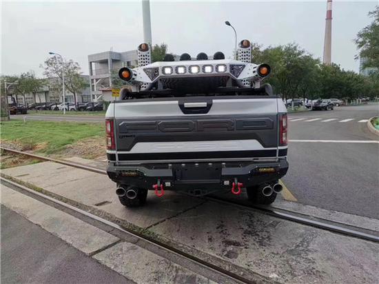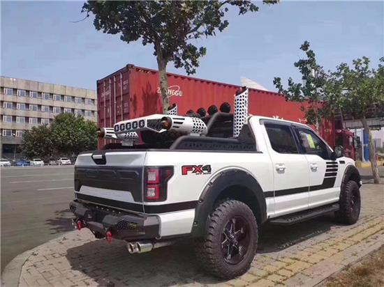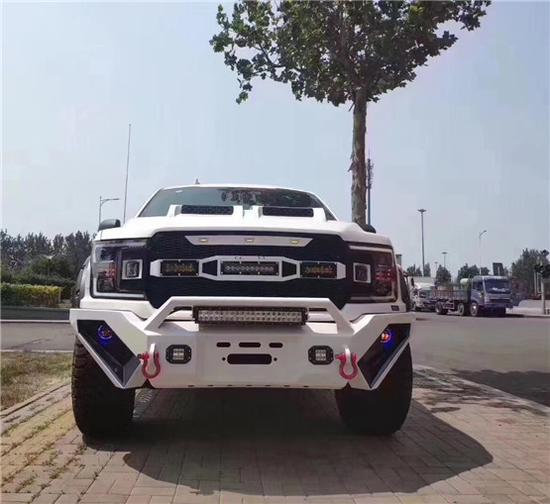 全新福特猛禽F150方方正正的前大灯与前保险杠造就了完美的车头造型与比例,进气格栅采用蜂窝状网格设计,并配以雕刻式的福特品牌标识。其前保险杠相当硬朗,且保险杠下方配备金属护板,以应对极端路况环境。整体的车架由高强度钢冲压而成,这样不但提高了车身的耐用性,更对乘客在安全方面有了进一步的保证。