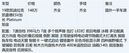 19款凯迪拉克凯雷德作为一款百万级的美式SUV,车身庞大,彪悍的外观特别适合男人的审美观,6.2升的发动机也无人可以匹敌,配置丰富。犀利的V型前脸设计、金属质感强烈的盾形进气格栅、直列式大灯和尾灯等,处处展现着凯迪拉克家族的澎湃血液。增大的前中网,更加凌厉的发动机线条,钻石切割的前大灯使前脸更加狂野。