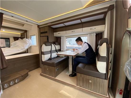 纵观整个宇通依维柯C型会客区,空间是非常大的,而且图为未拓展时空间,整个空间不仅配色高端奢华,且用料也极为考究。