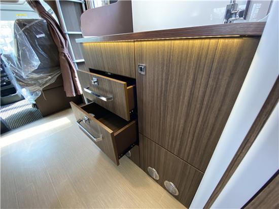 宇通依维柯C型搭配220V电磁炉,下置冷冻、冷藏分离式139L超大容量冰箱,解决您在旅途中的餐食保存问题,保证您可以吃到想吃的低温冷藏食品。厨房配置:220V电磁炉、抽油烟机、超大方形洗菜盆、洗菜盆内折叠水龙头、洗衣机。