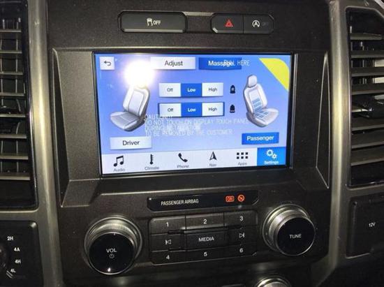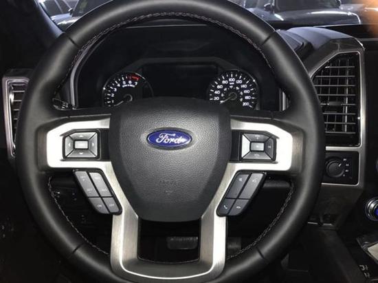 福 特F150车内配备标准独特的皮革和布艺装饰的座椅,驾驶员侧的电动十向调节。这些座椅同时具备记忆功能。中央控制区搭配了触控式显示屏,其下方则是多媒体控制区及空调面板,采用旋钮+物理按键的组合。中控功能区域可分为三个小控制区,最上端为音响控制及导航控制,中间为收音机调节控制,最低端为空调及座椅加热控制。