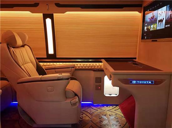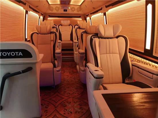 丰田考斯特10座改装商务车在外观的设计上无可挑剔,在内饰的改装上更是别出心裁。丰田考斯特10座改装商务车从内饰的设计上来说,多种色彩的搭配衬托出尊贵的色彩。丰田考斯特改装10座商务车在内饰的改装上尽显时尚元素,考斯特10座改装商务车在座椅的设计上更加注重舒适性与高贵感的追求,360度可旋转的航空座椅,配备高档办公桌,方便了我们的办公以及娱乐活动。丰田考斯特10座改装商务车同样可以采用全进口的埃尔法 (配置|询价)座椅,并且配备有通风加热以及电动脚托等等设备。为我们的旅行提供舒适的环境,缓解旅行过程中的疲劳。