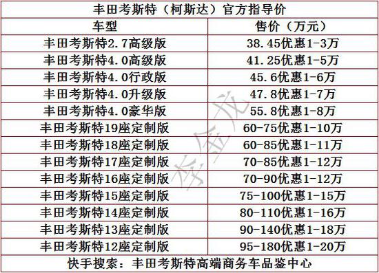 8座 9座、10座、11座、12座、13座、14座、16座、17座、18座、19座、20座、21座22座23座豪华内饰改装幸福家用,经典商用,长途旅游,丰田考斯特(柯斯达 (配置|询价))是名副其实多功能用车。经典款型畅销全球,丰田考斯特(柯斯达)大型降价活动现已正式开启,欢迎全国各地消费者到店到店赏车议价.