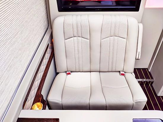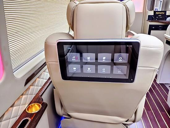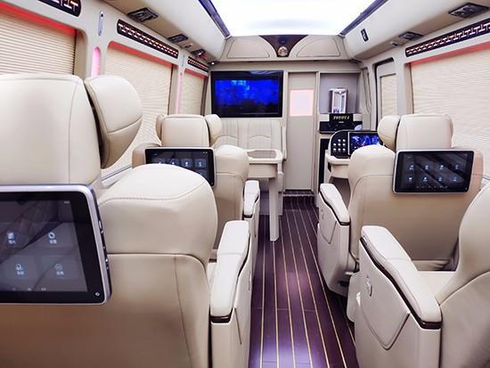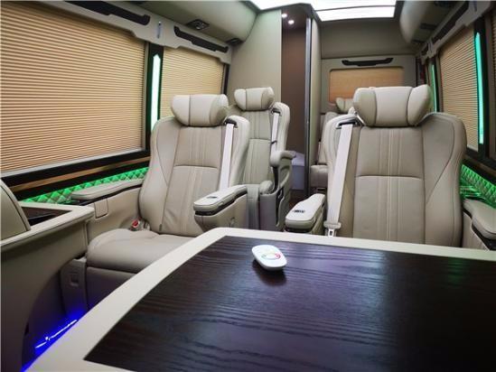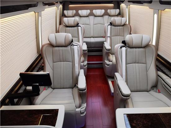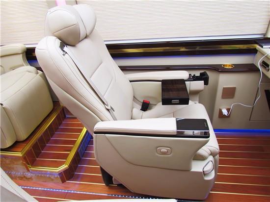 首长席航空座椅:高档首长座席由真皮航空座椅构成,根据人体工程学设计的弧度,使人体乘座更加舒适、贴切。让更贴合乘客的移动办公需求,让领导感受超乎寻常的尊贵感和舒适感13、侧壁更换蒙皮:侧壁更换意大利顶级真皮,手感舒适,侧壁菱形格的设计使整车层次分明立体感更强14、豪华电动窗帘:窗帘面料阻燃、隔热、隔光、隔音。15、A380空客顶灯设计不同灯光的颜色设计给人一种震撼的效 果!16、实木桃木纹侧壁压条:光鲜亮丽、易清洁。空气净化器:具有抗菌、除尘、除醛、除苯、消烟、补充空气维生素(负离子)等多重功效。18、 LED灯与长型荧光灯:特殊的灯光设计,保证了车内足够的亮度,且不会有刺眼的感觉,行车过程中即保证了车内办公的需要求又不影响驾使员行车安全。19、地毯:、阻燃、防污、抗踩踏,而且还具有多种天然功能。吸收空气中的污质,改善室内空气质量,提供了一个舒逸、温馨的生活环境