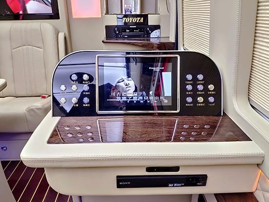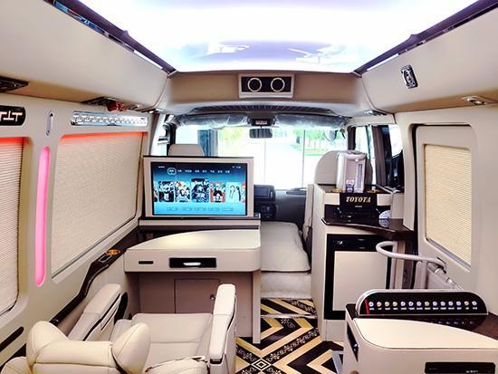 改装项目包括:1、半真皮半桃木纹方向盘、2、木纹仪表台:丰田原厂桃木纹仪表台3、3D实景卫星导航系统4、司机杂物盒:面板桃木纹装饰,带杯托、储物盒、边缘桃木纹防护栏5、驾驶舱隔板:驾驶 舱隔板半封闭式或者全封闭,包意大利NAPPA真皮。32寸液晶显示器6、车载冰箱:尼桑碧莲原装冰箱,可冷冻冷藏,冷冻可达零下18度,冷藏保持5度。3层式车载冰箱罩带雨伞支架。冰箱盖桃木纹装饰,箱体包意大利NAPPA真皮,箱底仿麂皮绒色7、地毯散件:阻燃、抗静电、防滑、环保。