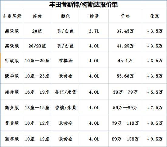 丰田专卖店新款柯斯达 (配置|询价)、考斯特、9座、10座、11座、12座、13座、15座、16座、17座、19座、20座、23座现车销售, 豪华内饰改装。丰田考斯特11座至尊版、柯斯达12座(奢华版、旗舰版、VIP版)13座(VIP版、超VIP尊贵版、至尊旗舰版)16座(超VIP版、超VIP商务版)17座(VIP版、超VIP商务版)颜色米黄金属色、合格证与座位相符!