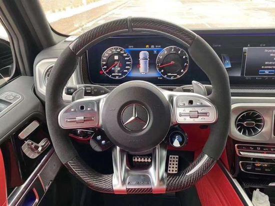 2020款全新奔驰G63内饰方面,2020款奔驰G63保留了新G500的整体设计,除配色差异外,新车还换装了全新造型的平底式AMG运动方向盘,其两侧配以打孔皮质包裹,下部镀铬装饰的造型也与新G500明显不同,看上去十分战斗。此外,全液晶仪表盘+中控大屏的双12.3英寸屏幕设计在新车上也没有缺席,营造出了浓郁的科技感。当然了,经典的“三把锁”按键自然不会缺失,并且设置在中控台最为显眼的位置。