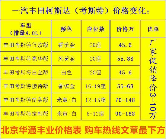 近日店内获悉:丰田柯斯达 (配置|询价)(丰田考斯特)超越平凡的动力,来自悦动的心COASTER 柯斯达导入全新动力引擎,更优化多项先进配置,整车性能跃然提升,自我超越永无止境。考斯特销售改装是丰田旗下的一款长7.005米,宽2.04米,高2.774米,属于中型客车,座位数多的23人定员,而丰田考斯特大的亮点就是内饰的豪华改装。丰田考斯特的座椅数量以及布局并非是一成不变,为了给客户更多的选择,丰田考斯特的座椅数量从10-23座不等,车内的空间是相同的,座位越少,车内的活动空间越大。