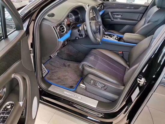 2020款宾利添越 V8设计版外观/内饰:鲸鱼黑/克莱因蓝配置:五座,舒适包,百年包 选装唯美套件:车身同色设计 镶钻百年灵钟表 珍珠母贝盘面前后舱照明包括LED欢迎灯和签名的宾利翅膀地面上照明外观和内饰唯美标志专属铭牌 中心面板外饰打孔舒适座椅上有一抹刺绣红色及‘DesignSeires‘字样Mulliner22自調式轮芯徽章, 钢琴黑色特别纹桃木(仪表板、副驾装饰板和车门处为碳纤维)。